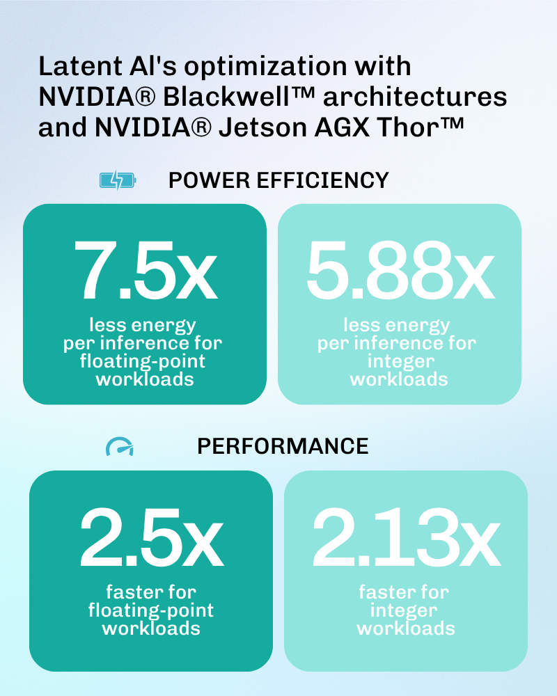 We’ve been working with the latest NVIDIA® Blackwell™ architectures, in particular NVIDIA Jetson AGX Thor™. Our benchmarks demonstrate optimized performance, up to 7.5x less energy per inference for floating-point and 5.88x less energy per inference for integer workloads, with 2.5x faster floating-point and 2.13x faster integer performance compared to the NVIDIA Jetson AGX Orin™.
