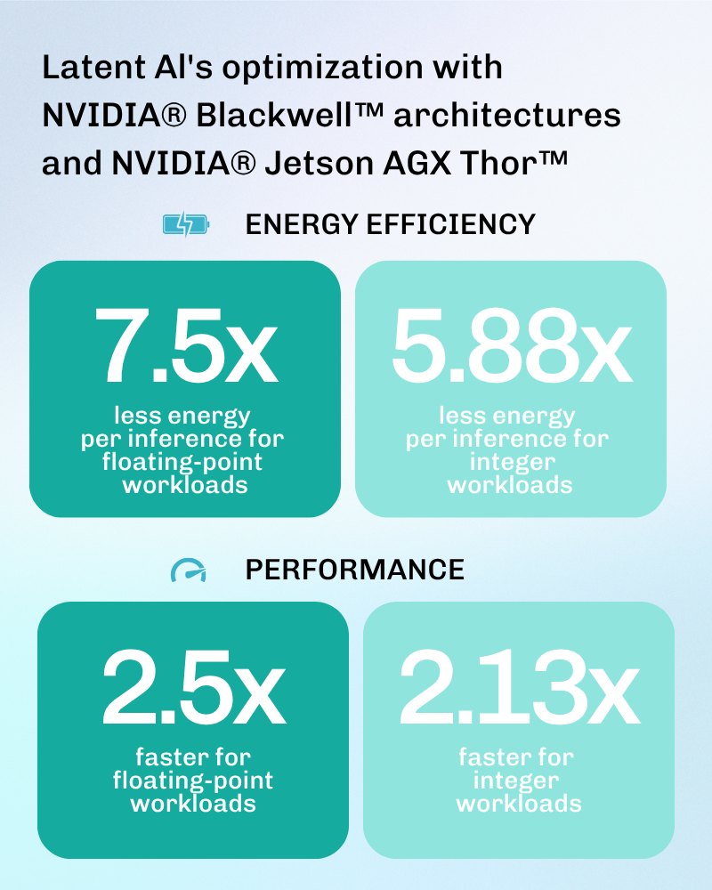 We’ve been working with the latest NVIDIA® Blackwell™ architectures, in particular NVIDIA Jetson AGX Thor™. Our benchmarks demonstrate optimized performance, up to 7.5x less energy per inference for floating-point and 5.88x less energy per inference for integer workloads, with 2.5x faster floating-point and 2.13x faster integer performance compared to the NVIDIA Jetson AGX Orin™.